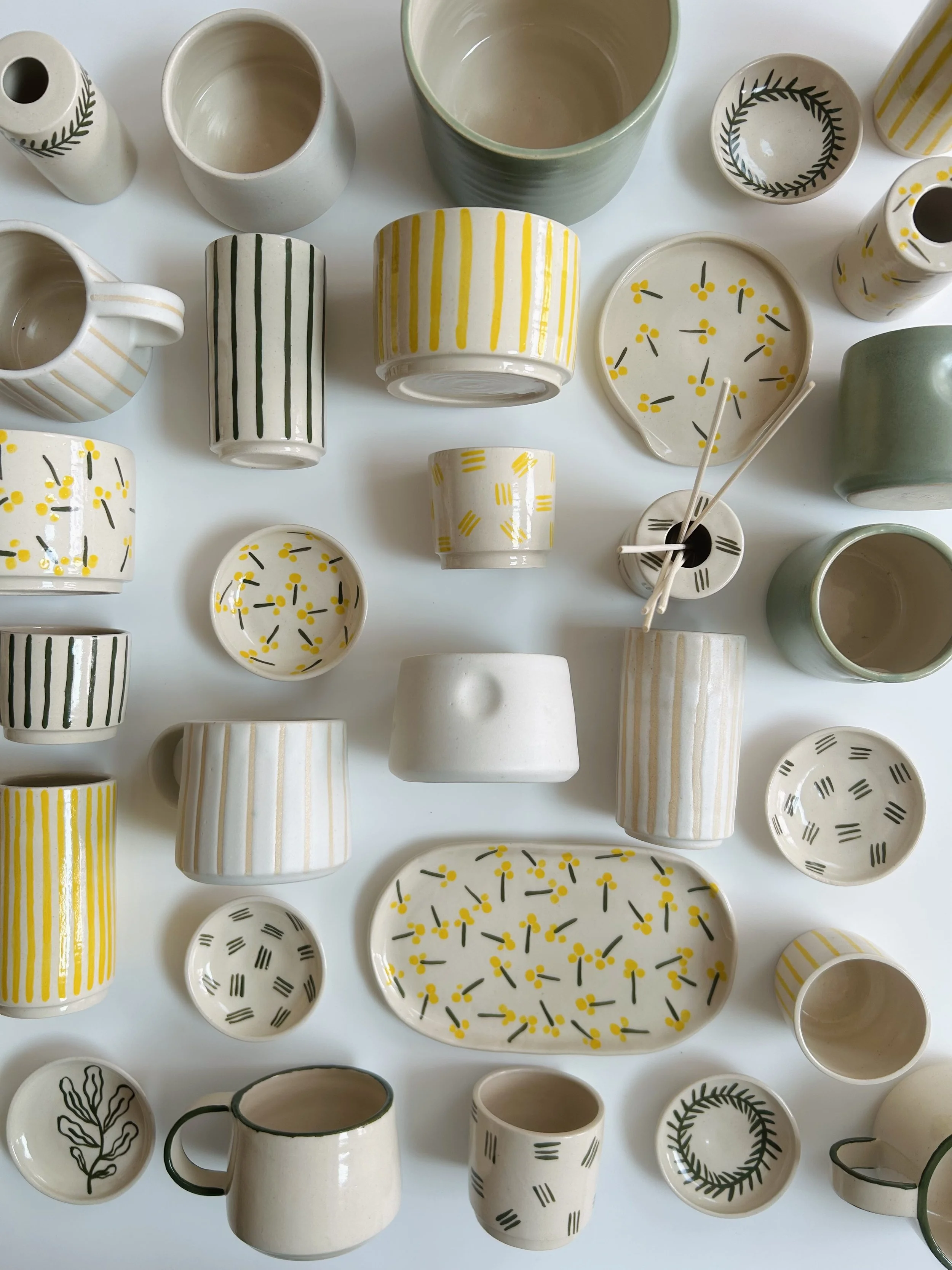 I'm Jemma, a ceramicist working from a plant-filled corner of my kitchen adapted into a mini pottery studio. I love to create useful and beautiful homeware with interesting design details, be that the handle shape, a geometric form or the surface decoration. I’m particularly inspired by the plants that surround me in my studio, and like to decorate my pieces with hand-painted, stylised leafy designs.